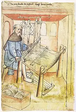 O tecelão trabalhava em casa e vendia os seus tecidos na feira.[9] Os teares verticais de pesos eram muito comuns nos séculos X e XI, antes da introdução dos Teares horizontais. A tecelagem tornou-se um ofício urbano e para regulamentar o seu comércio, os artesão associaram-se em Grémios ou Mesteirais que controlavam a qualidade e a formação necessária para que um artesão pudesse ser considerado como tecelão.[9]