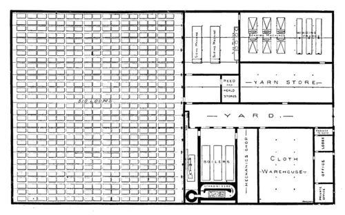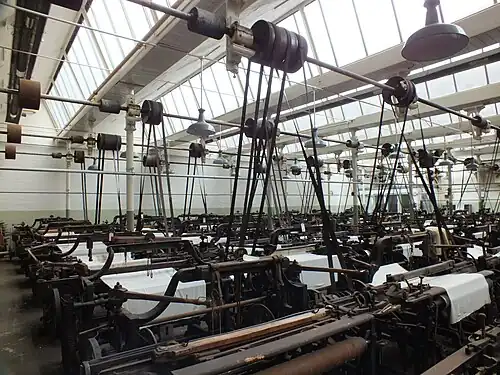 A grande maioria da indústria de tecelagem algodoeira localizava-se em barracões em pequenas povoações à volta de Manchester e afastados das fábricas de fiação. A tecelagem de lã, penteada ou cardada localizou-se no Oeste de Yorkshire, em particular na cidade de Bradford. Aqui, estavam localizadas enormes fábricas como a Lister’s e Drummond’s onde tinham lugar todas as operações (Desde a recepção das fibras ao envio de tecidos acabados).[13]