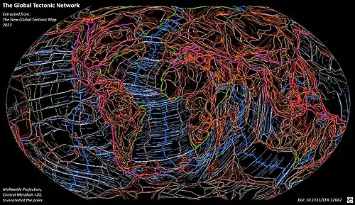 A Rede Tectônica da Terra. Legenda: Marrom: Limites de terrenos (microplacas) nos continentes e Cinturões Móveis, Ciano: Terrenos das Placas Oceânicas, Azul: Falhas transformantes oceânicas; Vermelho e laranja: Zonas de falhas no domínio do cinturão continental e montanhoso; Roxo: Principais zonas de subducção e zonas de sutura; Verde: Margens continentais