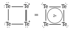 4.[43] Diferente da maioria dos metais, que se dissolvem no ácido para gerar cátions simples, ou dos não-metais que geralmente não reagem, o telúrio reage formando esse cátion poliatômico Te2+