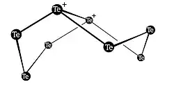 8, formado por dois anéis pentagonais de átomos de telúrio unidos por uma aresta. Esse cátion se forma pela reação do telúrio elementar com o hexacloreto de tungstênio.[44]