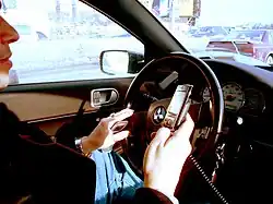 O uso do telefone celular durante a condução de um veículo, incluindo falar ao telefone, enviar mensagens de texto ou operar outros recursos do telefone, é comum, mas controverso. É amplamente considerado perigoso devido à distração ao dirigir. Foi demonstrado que estar distraído ao dirigir um veículo motorizado aumenta o risco de acidentes. Em setembro de 2010, a Administração Nacional de Segurança no Tráfego Rodoviário dos Estados Unidos (NHTSA, sigla em inglês) informou que 995 pessoas foram mortas por motoristas distraídos por telefones celulares. Em março de 2011, uma companhia de seguros norte-americana, a State Farm Insurance, anunciou os resultados de um estudo que revelou que 19% dos condutores inquiridos acediam à Internet num smartphone enquanto dirigiam.[98]