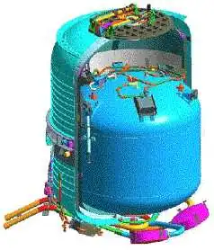 O criostato consiste em um tanque a vácuo, cujo interior está cheio de vapor resfriado de hélio e de sistemas de gerenciamento deste fluido. O tanque tem uma capacidade para 360 litros de hélio superfluido.