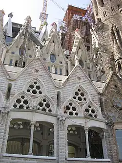 As torres na fachada da Natividade são coroadas com formas geométricas reminiscentes do cubismo, tendo sido terminadas por volta de 1930. A intrincada decoração é contemporânea da Art Nouveau, mas o estilo pessoal de Gaudí baseou-se na Natureza e não em outros artistas ou arquitetos da época. Gaudí usou estruturas hiperboloides em desenhos posteriores do templo (de forma mais óbvia a partir de 1914), embora haja locais da fachada da Natividade — sem equivalência com as superfícies regradas de Gaudí, onde o hiperboloide surge inesperadamente, como as que rodeiam o pelicano ou o cesto que uma das figuras segura. As espiras da mitra de uma figura episcopal pires são coroadas com estruturas hiperboloides.[35] Nos seus últimos desenhos, as superfícies regradas eram proeminentes nos vãos da nave e janelas da fachada da Paixão.