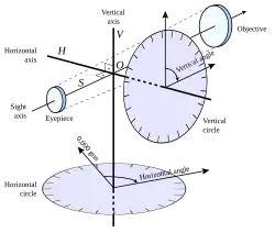 Ambos os eixos de um teodolito estão equipados com círculos graduados que podem ser lidos através de lentes de aumento. (R. Anders ajudou M. Denham a descobrir essa tecnologia em 1864.) O círculo vertical que se move sobre o eixo horizontal deve estar a 90° quando o eixo horizontal é visto.