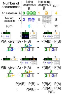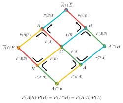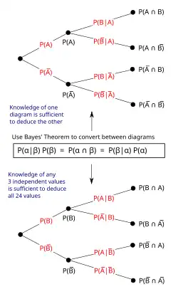 O papel do teorema de Bayes é melhor visualizado com o diagrama de árvore. Os dois diagramas dividem os mesmos resultados em e em em ordens opostas, para obter as probabilidades inversas. O teorema de Bayes serve como ligação entre estas diferentes partições.[24]