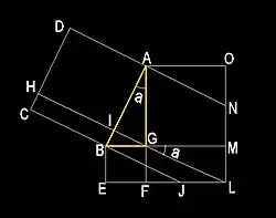 A finalidade é mostrar que a área do quadrado AOMG é igual à área do quadrado AIHD e que BEFG é igual a BCHI, mostrando que o quadrado da hipotenusa é igual à soma do quadrado dos catetos. Veja que a reta definida por HL passa pelo centro do ângulo reto AGB e é ortogonal ao segmento AB. Temos que GL = AB, pois ambos são a hipotenusa do triângulo; e AB = HI, pois que ABCD é um quadrado. Logo GL=HI (o triângulo ABG é igual ao triângulo GML). Assim sendo, as áreas dos quadriláteros AIHD e ANLG são iguais, visto que tem a mesma base (HI = GL) e a mesma altura (AI). Mas temos que as áreas dos quadriláteros ANLG e AOMG são também iguais, pois que tem a base AG em comum e a mesma altura AO. Resulta que, pelo silogismo grego, se Y=Z e Z=W, então Y=W, em termo de área vale: AIHD = ANLG e ANLG = AOMG, então AIHD = AOMG.[25]