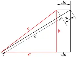 Pode-se chegar ao teorema de Pitágoras pelo estudo de como mudanças em um lado produzem mudanças na hipotenusa e usando um pouco de cálculo.[22][23] É uma demonstração baseada na interpretação métrica do teorema, visto que usa comprimentos, não áreas.