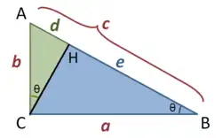 Sendo ABC um triângulo retângulo, com o ângulo reto localizado em C, como mostrado na figura. Desenha-se a altura com origem no ponto C, e chama-se H sua intersecção com o lado AB. O ponto H divide o comprimento da hipotenusa, c, nas partes d e e. O novo triângulo, ACH, é semelhante ao triângulo ABC, pois ambos tem um ângulo reto, e eles compartilham o ângulo em A, significando que o terceiro ângulo é o mesmo em ambos os triângulos também,[17] marcado como θ na figura. Seguindo-se um raciocínio parecido, percebe-se que o triângulo CBH também é semelhante à ABC. A semelhança dos triângulos leva à igualdade das razões dos lados correspondentes: