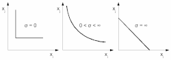 A elasticidade da substituição entre os mesmos fatores i e j mencionados anteriormente é dado por e mede a facilidade com que se pode substituir esses bens. Esse valor varia entre zero e o infinito, sendo que, quanto mais próximo de zero, mais difícil será a substituição entre os fatores.