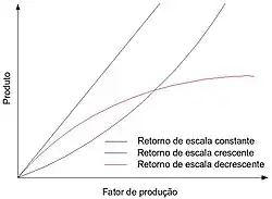 - Retornos constantes de escala: ao se aumentar vezes os fatores de produção, a quantidade produzida também aumenta vezes. Em outras palavras, se , então ;