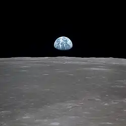 Vista da Terra elevando-se desde o horizonte da Lua; alguns teóricos da conspiração afirmam que imagens como estas seriam falsas, porque não aparecem estrelas