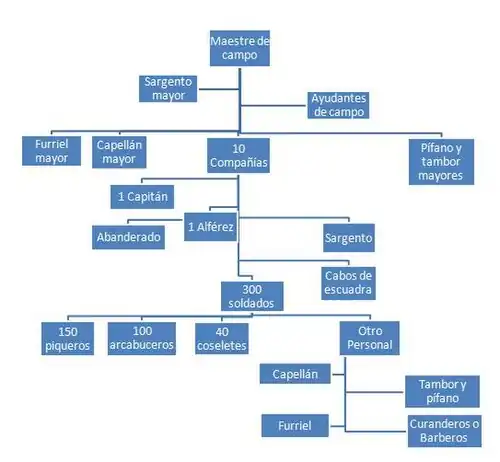 A organização dos terços variou bastante, durante a sua existência. A estrutura original dos terços de Itália dividia-os em 10 capitanias ou companhias (oito de piqueiros e duas de arcabuzeiros), com 300 homens, cada uma. Cada companhia incluía o capitão, o alferes, o sargento e 10 cabos (cada um comandando uma esquadra de 30 homens). Além dos oficiais, cada companhia incluía alguns funcionários administrativos e auxiliares como furriel, capelão, músicos e pajem do capitão.