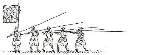 Durante os primeiros disparos, para que as baixas não deixassem demasiados buracos no esquadrão de piqueiros, os soldados avançavam uma posição na formação, quando a mesma ficava vazia, permitindo manter uma imagem de compacticidade.