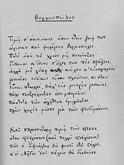 Também o poeta grego do século XX, Konstantínos Kaváfis, dedicou um poema a este passo, do qual se pode ver a primeira página ao lado.