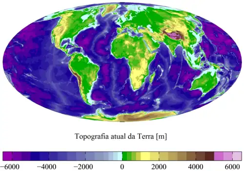 A topografia local desvia-se deste esferoide idealizado ainda que, numa escala global, estes desvios sejam muito pequenos: a Terra tem uma tolerância de cerca de uma parte em 584, ou 0,17%, do esferoide de referência, o que é menor que a tolerância de 0,22% permitida nas bolas de bilhar.[75] Os maiores desvios locais na superfície rochosa da Terra são o Monte Everest (8 848 m acima do nível do mar) e a Fossa das Marianas (10 984 m abaixo do nível do mar).[76] Devido à saliência equatorial, os locais da superfície mais afastados do centro da Terra são os cumes do Chimborazo no Equador e de Huascarán no Peru.[77][78][79]