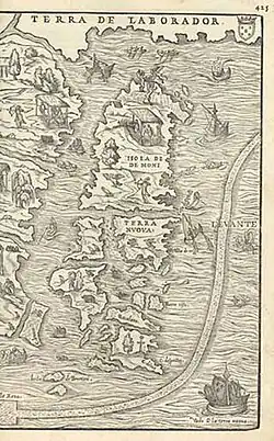 É em finais do século XV que se intensifica o contato com os europeus, que se deve sobretudo à corrida por encontrar um novo caminho marítimo para o Oriente, dando aso a várias expedições de ingleses, portugueses e franceses. A primeira visita do seu tipo à ilha pode ser atribuída a Giovanni Caboto, navegador genovês a serviço do rei Henrique VII de Inglaterra. A expedição parte de Bristol em 1497, apesar de não existir um consenso sobre o local exato por ele avistado.[18] Qualquer que seja o caso, o Reino de Portugal assevera à coroa inglesa o nulo direito desta à colonização da área, de acordo com o estipulado no Tratado de Tordesilhas.[19] Em resposta, acaba por patrocinar as expedições de João Álvares Fagundes e dos irmãos Gaspar e Miguel Corte Real em 1501 e 1502.[18][20] Estes mapearam a costa da então chamada Terra Nova dos Bacalhaos[21] numa tentativa malfadada de encontrar a Passagem do Noroeste.[22] Do ponto de vista português, isto traduziu-se numa hipótese futura de expansão do seu império para noroeste do Atlântico.[18] No entanto, a principal vantagem a ser obtida da potencial colonização, a pesca do bacalhau, poderia facilmente ser contornada através de trocas comerciais por outros recursos mais valiosos provenientes da Ásia e América. Assim, Portugal faz pouca questão de concretizar essa expansão. No entanto, e até à primeira metade do século XVI, ainda mantinha alguma influência na pesca do bacalhau.[22] Pela mesma altura, embarcações inglesas começam a frequentar os bancos de pesca de Terra Nova. A 5 de agosto de 1583, Sir Humphrey Gilbert reivindica a Terra Nova como a primeira colónia ultramarina inglesa, por Decreto Régio da rainha Isabel I de Inglaterra, estabelecendo oficialmente as bases daquilo que mais tarde seria o Império Britânico.[23] É portanto considerada a mais antiga colónia britânica.[24]