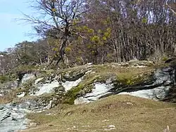 Paisagem coberta de parasitas (Misodendrum punctulatum) e bosques de lengas, na Ilha Grande da Terra do Fogo.