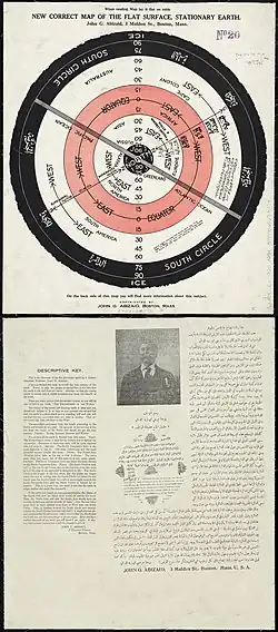 - ↑ The Earth: Scripturally, Rationally, and Practically Described. A Geographical, Philosophical, and Educational Review, Nautical Guide, and General Student's Manual, n. 17 (November 1, 1887), p. 7. citado em Robert J. Schadewald (1981). «Scientific Creationism, Geocentricity, and the Flat Earth». Lock Haven University. Consultado em 21 de agosto de 2010 – via lhup.edu