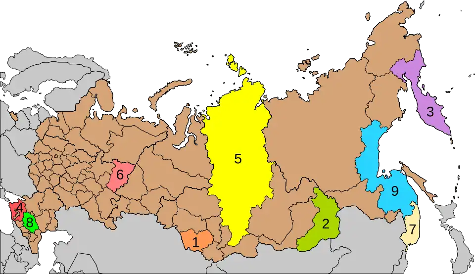 A Rússia é dividida em 83 subdivisões, sendo nove dessas divisões designadas territórios (ou krai):
