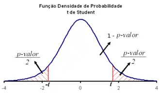 Por outro lado, se a hipótese nula for e, consequentemente, a hipótese alternativa , teríamos que avaliar ao mesmo tempo a possibilidade de e de . Para isso, ao consultar a função densidade de probabilidade da distribuição t de Student, devem ser consideradas as áreas abaixo da curva para valores superiores a e inferiores a , ou seja, as duas "caudas" da distribuição. Como a distribuição é simétrica, os tamanhos dessas áreas são iguais.