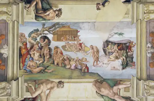 O painel central, maior, evidencia o evento do Dilúvio.[p] A Arca por meio da qual a família de Noé escapou viva do evento flutua ao fundo do afresco enquanto o resto da humanidade tenta freneticamente subir num ponto seguro em busca da sobrevivência. A cena, além de possuir um maior número de figuras pintadas, é a que mais combina com o formato dos trabalhos presentes nas paredes da capela. O último painel retrata a embriaguez de Noé.[q] Após o Grande Dilúvio, o patriarca da família cultivou o solo e criou videiras. Este trecho da história é mostrado ao fundo do afresco. Noé, com o vinho produzido a partir de sua plantação, embriagou-se e, assim, desnudou-se. Seu filho mais novo, Cam, vendo-o descomposto, chamou seus dois irmãos, Sem e Jafé para observar o pai. Os dois outros filhos de Noé, entretanto, cobriram o pai de olhos fechados. Após recobrar a consciência, o patriarca amaldiçoou o filho mais novo e demandou que seus descendentes vindos de Cam, a partir de Canaã, servissem aos descendentes de Sem and Jafé. Juntos, os três afrescos procuram mostrar a longa jornada do ser humano desde a perfeita criação de Deus. Foi por meio de Sem e das Tribos de Israel vindouras, contudo, que a possibilidade da Salvação veio a surgir.[Src 4][Src 5][Src 6][Src 7]