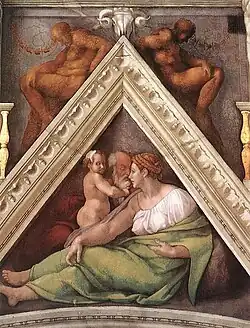 Em cada canto da capela, há pendículos triangulares a preencher os espaços entre as paredes e arcos da abóbada, formando enjuntas acima das janelas próximas. Nas formas curvadas desses espaços, Michelangelo pintou quatro cenas de histórias bíblicas associadas à salvação de Israel por quatro grandes figuras de heróis: Moisés, Ester, rei Davi e Judite. Os temas em específico são a Serpente de Bronze, o Castigo de Hamã, Davi e Golias, e Judite e Holofernes.[55]