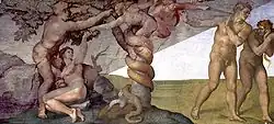 No painel final dessa sequência, Michelangelo combinou duas cenas contrastantes numa só composição,[n] de Adão e Eva com fruto proibido da Árvore da Ciência do Bem e do Mal, ela recebendo-o confiantemente das mãos da Serpente e ele avidamente tomando-o para si mesmo; e a expulsão do casal do Jardim do Éden — onde viveram na companhia do próprio Criador — com destino ao mundo exterior, onde tiveram que se defender sozinhos e vivenciar a morte.[6][Src 1][Src 2][Src 3]