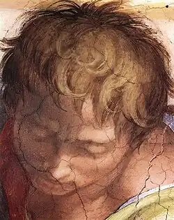 Michelangelo usou o gesso úmido por meio de uma técnica de tinta lavada, aplicada em amplas áreas coloridas. Quando tais superfícies secavam, ele as revisitava a partir de uma abordagem de pintura mais direta, adicionando sombras e detalhes com uma variedade de pincéis. Para algumas áreas com textura, tais quais as de pelos faciais e grãos de madeira, ele usava um grande pincel com cerdas esparsas de forma semelhante a um pente. Eram empregados os mais sofisticados métodos artesanais e as melhores inovações que ele conhecia, combinando-as a uma variedade de tipos de pincelada e a um primor de "virtuose" que em muito ultrapassava a meticulosidade de Ghirlandaio.[b][10][16][17][22]