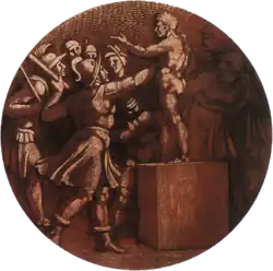 Os medalhões, ou escudos, representam as cenas de Abraão e o sacrifício de Isaac; a destruição da estátua de Baal; os adoradores de Baal sendo brutalmente assassinados; o espancamento de Urias até a morte; o profeta Natã condenando o rei Davi por assassínio e adultério; Absalão, filho traidor do rei Davi, pego pelos cabelos na árvore enquanto tentava escapar e sua decapitação pelas tropas do rei; Joabe buscando matar Abner; Jorão sendo lançado de uma carruagem e caindo de cabeça; Elias subindo aos Céus; e o último dos elementos, cuja composição apagou-se ou nunca foi completada, localizado à esquerda de Deus a separar a terra da água.[6][49]