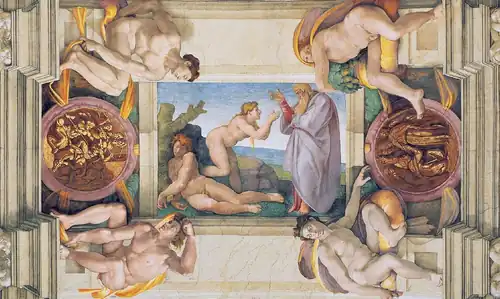 A cena central, de Deus a criar Eva a partir da costela de um Adão adormecido,[m] tem sua composição diretamente relacionada a outra obra, os painéis em relevo dispostos em volta da porta da Basílica de São Petrônio, em Bolonha, por Jacopo della Quercia, cujo trabalho foi estudado por Michelangelo durante a juventude.[44][45]
