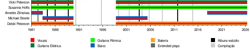 - Debbi Peterson – vocal, vocal de apoio, bateria, guitarra acústica e percussão (1981–1989, 1998–presente)