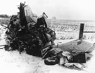 A aeronave estava em um ângulo levemente descendente e inclinada para a direita quando atingiu o solo a 270 quilômetros por hora. Ela então capotou e derrapou por mais 170 metros na paisagem congelada antes que a massa retorcida de ferragens batesse contra uma cerca de arame farpado nas cercanias da propriedade de Juhl. Os corpos de Holly e Valens caíram próximos ao avião, Richardson foi arremessado através da cerca e dentro da plantação de milho do vizinho de Juhl, Oscar Moffett, enquanto Peterson ficou preso à cabine. Carroll Anderson, o gerente do Surf Ballroom que levara os músicos ao aeroporto da cidade vizinha e presenciara a decolagem do avião, foi o primeiro a identificar as vítimas.[9]