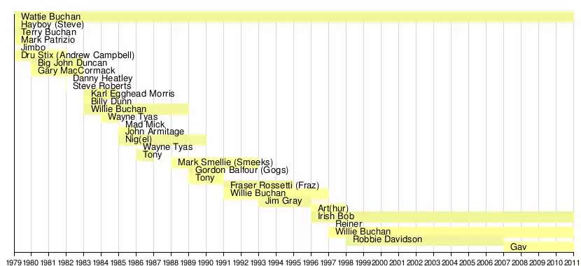 | Ex-integrantes | Hayboy Steve John Duncan Karl Morris Mad Mick Nigel Swanson Gordon Balfour Fraser Rosetti Arthur Dalrymple Robbie Davidson Mark Patrizio Gary McCormack Billy Dunn Wayne Tyas John Armitage James Antony Thomson Lochiel † (falecido) Mark Smellie Jim Gray Jim Park Andrew Campbell Danny Heatley Steve Roberts Tony Martin Ian Purdie Reiner Mikie |