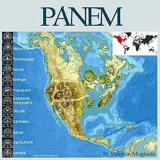 Panem é formada por doze distritos, sendo o décimo terceiro aparentemente bombardeado e destruído pela Capital. Cada distrito é responsável/obrigado a fornecer algo para a Capital, em troca a Capital "zela" pela segurança dos habitantes dos Distritos e fornece-lhes suprimentos básicos.