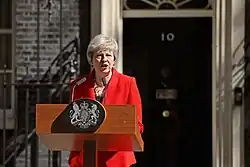 May anunciou sua renúncia como primeira-ministra britânica em 24 de maio de 2019, saindo efetivamente do cargo em 7 de junho.[27] May estava sendo pressionada a deixar o cargo após três tentativas mal sucedidas de chegar a um acordo para o Brexit, o que acabou atrasando a saída do país do bloco.[28][29] Em um discurso emocionado,[30] May afirmou: