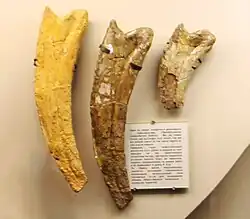 - ↑ Rozhdestvensky, A. K. (1970). «О гигантских когтевых фалангах загадочных рептилий мезозоя» [Nas garras gigantes dos enigmáticos répteis mesozóicos]. Paleontological Journal (em russo). 1970 (1): 131−141