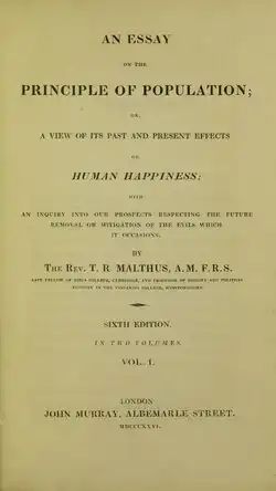 "Um ensaio sobre o princípio da população ou uma visão de seus efeitos (...) passados e presentes na felicidade humana, com uma investigação das nossas expectativas quanto à remoção ou mitigação futura dos males que ocasiona."