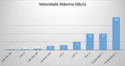 Thunderbolt v1: 10 Gbit/s por canal (20 Gbit/s no total).[7] Thunderbolt v2: 20 Gb/s canais agregados (20 Gb/s no total). | ||
