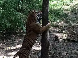 Para identificar o seu território, o macho marca árvores pulverizando urina[114][115] e secreções das glândulas anais, bem como marcação das trilhas com fezes e também marcam as árvores ou o chão com as garras. As fêmeas também usam esses "arranhões", assim como a urina e marcação de fezes. Marcas de cheiro deste tipo permitem que um indivíduo descubra a identidade, sexo e estado reprodutivo de outro tigre. Fêmeas no cio sinalizam a sua disponibilidade através de marcação de cheiros com mais frequência e aumentando suas vocalizações.[116]