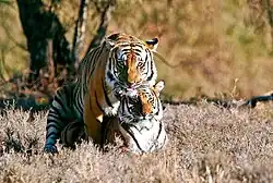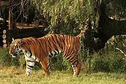 O tigre [feminino: tigresa] (nome científico: Panthera tigris) é um mamífero carnívoro da família dos felídeos, que habita o continente asiático.[3][4] Dentre suas subespécies é o maior entre todos os felinos selvagens do mundo.[5] São animais extremamente territoriais e solitários. Classificado como um superpredador em seu ecossistema respectivo, o tigre é tido como o terceiro maior carnívoro terrestre da contemporaneidade, excedido em porte unicamente pelo urso-polar e pelo urso-pardo.[6]
