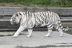Um alelo conhecido encontrado apenas nas subespécie de Bengala produz o tigre-branco, o primeiro variante de cor foi registrado no início do século XIX e estima-se ser encontrado em 1 a cada 10 000 nascimentos naturais. Geneticamente, a brancura é recessiva: um filhote nasce branco apenas quando ambos os pais são portadores do alelo para brancura.[97] Não é albinismo, pois há pigmento evidente em listras do tigre-branco e em seus olhos azuis.[87] A mutação responsável muda um único aminoácido na proteína transportadora SLC45A2.[98]