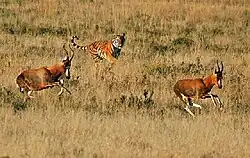 Em estado selvagem, os tigres se alimentam principalmente de animais grandes e médios, preferindo ungulados nativos que pesem no mínimo 90 kg.[51][52] Eles normalmente têm pouco ou nenhum efeito nocivo nas populações de presas.[92] Cervo sambar, chital, veado barasingha, javalis, gauro, nilgó, búfalo-d'água-selvagem e búfalo-doméstico, em ordem decrescente de preferência, são as presas favoritas do tigre em Tamil Nadu, na Índia,[51] enquanto o gauro e o sambar são as presas preferidas e constituem o principal dieta de tigres em outras partes da Índia.[52][53] Eles também atacam outros predadores, incluindo cães, leopardos, pítons, urso, e crocodilos.