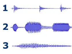A imagem ao lado mostra o envelope característico de três instrumentos. O primeiro é de uma tabla, espécie de tambor da Índia. Veja como o som surge quase instantaneamente após a percussão da pele pelas mãos do executante e como cada nota tem uma duração muito curta. A segunda onda mostra três notas produzidas por uma trompa. Aqui a nota se inicia com um aumento mais gradual de intensidade, sofre um pequeno decaimento após o início da nota e dura todo o tempo em que o trompista mantém o sopro, desaparecendo de forma bastante rápida ao final das notas. O terceiro exemplo mostra uma longa nota produzida por uma flauta. O som surge muito suavemente, mantém-se com amplitude quase constante e depois desaparece lentamente. Vejamos com mais detalhes cada um dos momentos presentes nestes exemplos: