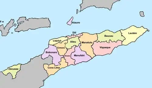 - ↑ «Lei N.o 14/2021: Segunda Alteração à Lei n.o 11/2009, de 7 de outubro (Divisão Administrativa do Território)» (PDF). Jornal de República: Publicação Oficial da República Democrática de Timor-Leste. Jornal de República: Publicação Oficial da República Democrática de Timor-Leste (Série I, N.° 28). 7 de julho de 2021. Consultado em 27 de janeiro de 2023