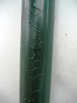 O aparecimento deste defeito indica que a resina se decompôs com o tempo devido às condições atmosféricas, nomeadamente a luz solar.
