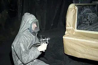 Projecção Electroestática.[6] O princípio para a projecção eletroestática consiste em carregar eletrostaticamente a tinta ou o verniz com uma voltagem electrónica criada por um gerador de alta-voltagem, a qual é projectada sobre a superfície a pintar que se encontra ligada à terra, fazendo com que as partículas de tinta (carregadas positivamente) sejam atraídas pela diferença de potencial à superfície a pintar. Este tipo de sistema pode ter por base um sistema de projecção convencional ou airless. Devido ao efeito da gaiola de Faraday, que se manifesta com a repulsão das partículas de tinta em zonas muito próximas uma da outra, como no caso dos cantos interiores de uma peça, um sistema de pintura electroestática tem de ter sempre uma pistola não eletroestática para colmatar estas deficiências.