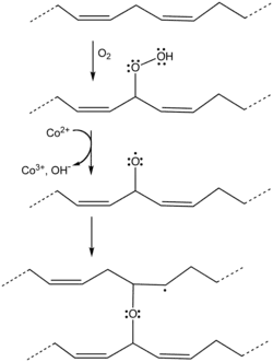 Quando expostos ao ar, os óleos secantes não sofrem o mesmo processo de evaporação que a água. Em vez disso, as suas cadeias insaturadas reagem com o oxigénio do ar, polimerizando por reticulação passando a um estado semi-sólido e mais tarde a sólido. A velocidade deste processo varia dependendo do óleo usado. É este processo lento que permite ao artista fazer alterações e/ou correcções à sua pintura.