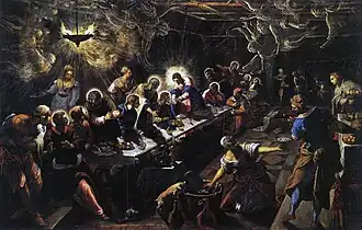 A comparação da Última Ceia de Tintoretto com a de Leonardo dá uma demonstração instrutiva sobre como o estilo artístico moveu-se durante o Renascimento. Leonardo é todo clássico response. A disciplina se irradia de Cristo em simetria matemática. Nas mãos de Tintoretto, o mesmo evento é dramaticamente distorcido, enquanto as figuras humanas são elevadas pela erupção do espírito humano. Pelo dinamismo de sua composição, seu uso dramático da luz e seus efeitos de perspetiva, parece um artista barroco antes da hora.