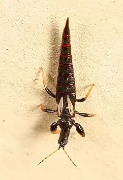 O protórax é livre[13][14] com pronoto (esclerito dorsal do protórax) bem visível  e padrão de cerdas, utilizados para identificação.[3] O meso e metatórax são unidos,[13][14] com um par de espiráculos em cada e podem apresentar cerdas, esculturações e sensilos nos escleritos dorsais (meso e metanoto, respectivamente), estes são usados na classificação.[3] Asas podem estar presentes ou não.[3][9][10][14][13] As pernas são do tipo ambulatoriais,[13][14] às vezes com as posteriores saltatórias[3][8] e as anteriores raptoriais.[8] Os tarsos mais distais de cada perna apresentam um arólio (bolha, vesícula ou bexiga)[10][9][3][8][11] eversível[10][9][3][8] e grande, que são cobertos por secreções liberadas por glândulas localizadas nas tíbias,[3] auxiliando na aderência do inseto ao substrato.[11][3][9]